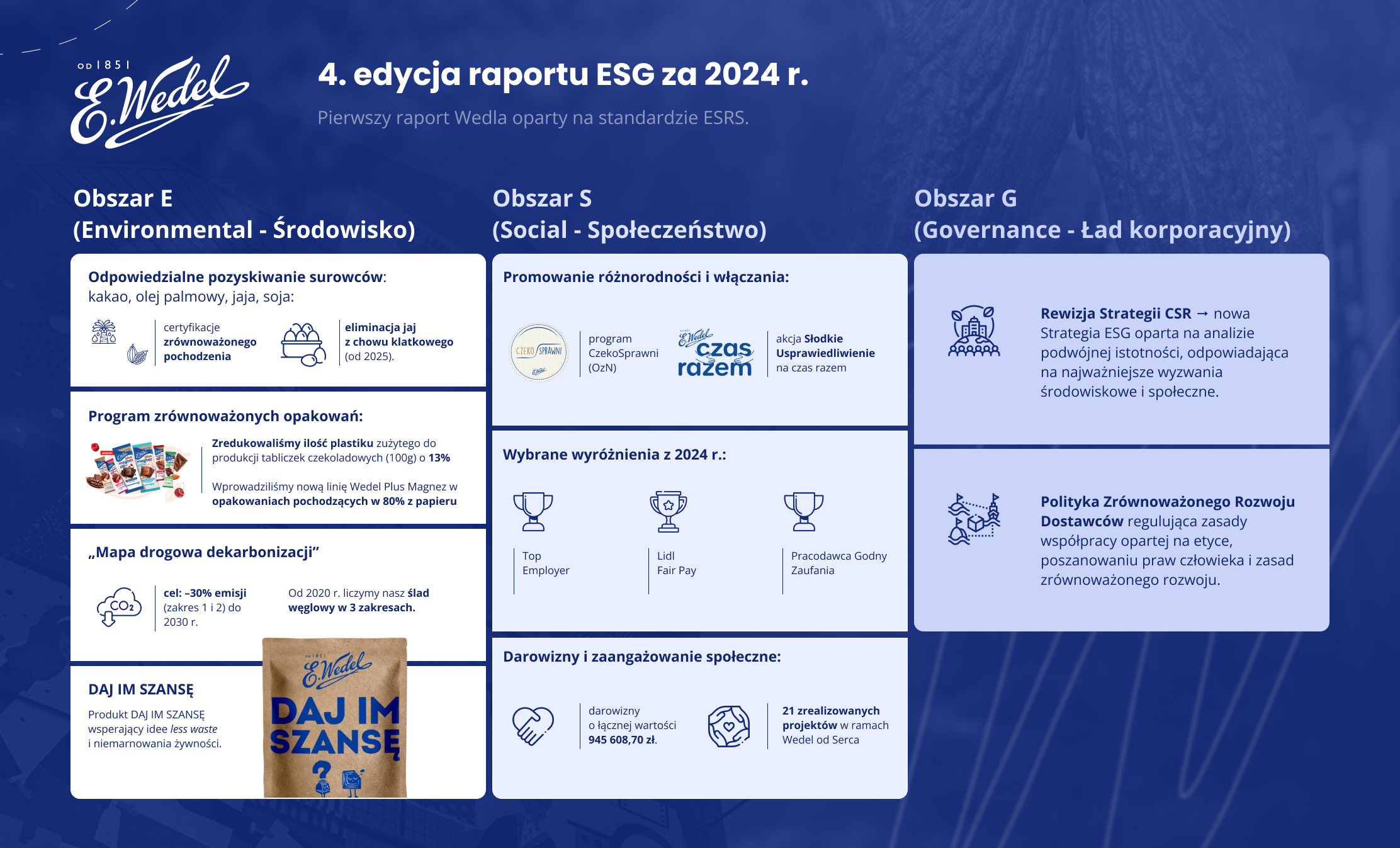 – Przykładem działań w zakresie Ładu korporacyjnego (G) jest trwający od 2024 roku proces rewizji naszej Strategii CSR w odpowiedzi na zmiany regulacji unijnych w obszarze zrównoważonego rozwoju. Zaowocuje on wprowadzeniem nowej Strategii ESG regulującej i porządkującej najistotniejsze z punktu widzenia interesariuszy wewnętrznych i zewnętrznych kwestie. Wsłuchiwanie się w głos otoczenia to fundament pozwalający na budowanie zaufania do firmy. W Wedlu staramy się być liderami transparentności, dzięki czemu możemy oferować naszym konsumentom produkty o wysokiej jakości, przygotowywane zgodne z najlepszymi standardami etycznymi – skomentował Mateusz Hendzel, Kierownik Ładu Korporacyjnego i Zapewnienia Zgodności w firmie Wedel.